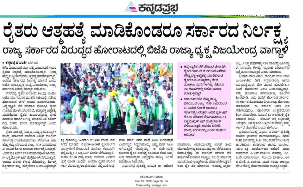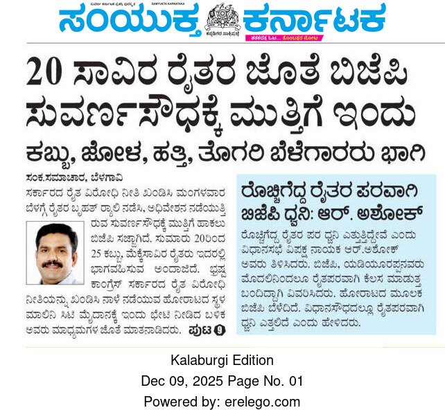 20 ಸಾವಿರ ರೈತರ ಜೊತೆ ಬಿಜೆಪಿ ಸುವರ್ಣಸೌಧಕ್ಕೆ ಮುತ್ತಿಗೆ ಇಂದು